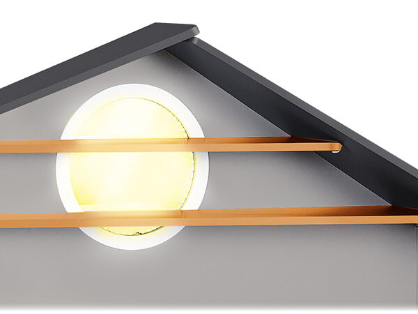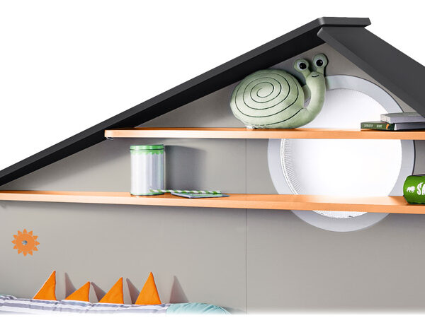 Леглото разполага с удобна подматрачна рамка, подходяща за матрак с размери 100 x 200 см. Допълнителните рафтове и вградената етажерка осигуряват практично място за съхранение, а вграденото осветление придава магическа атмосфера на помещението.Леглото е оборудвано с вградена LED нощна лампа, оформена като кръгъл прозорец. Тя разпръсква мека, приятна светлина, създавайки уютна атмосфера за спокоен сън. Бутонът за включване, изработен във формата на слънце, внася допълнителен щрих в общия дизайн.Липсата на остри ръбове и ъгли, заедно с частичната преграда, допринасят за красивата визия и безопасността във всеки един момент. Леглото е част от колекция BREDA, която включва скрин, гардероб, пейка, етажерка, килим, лампи и други аксесоари.