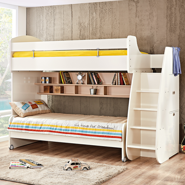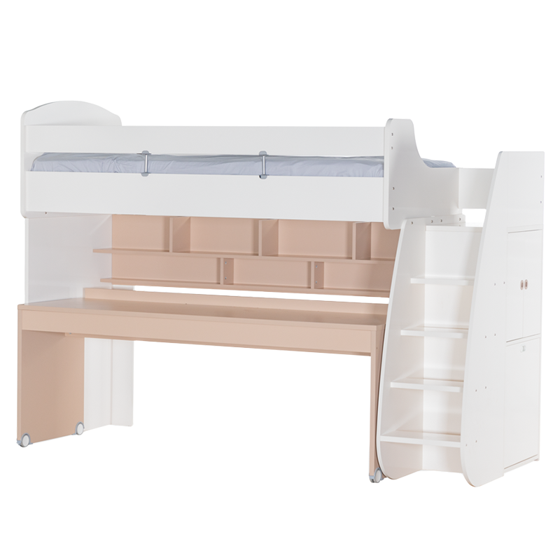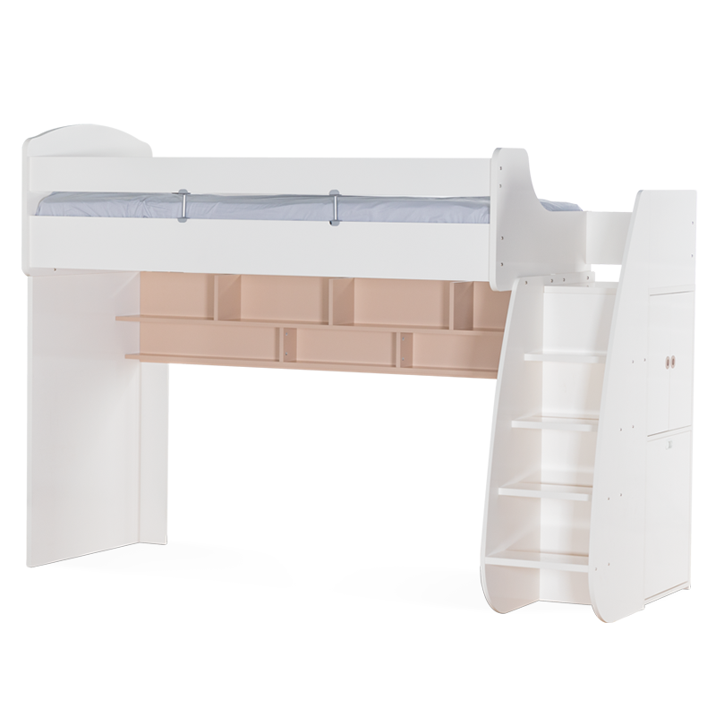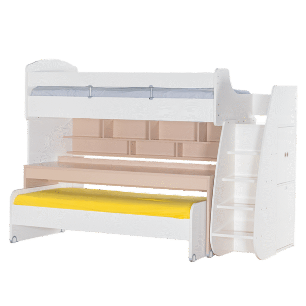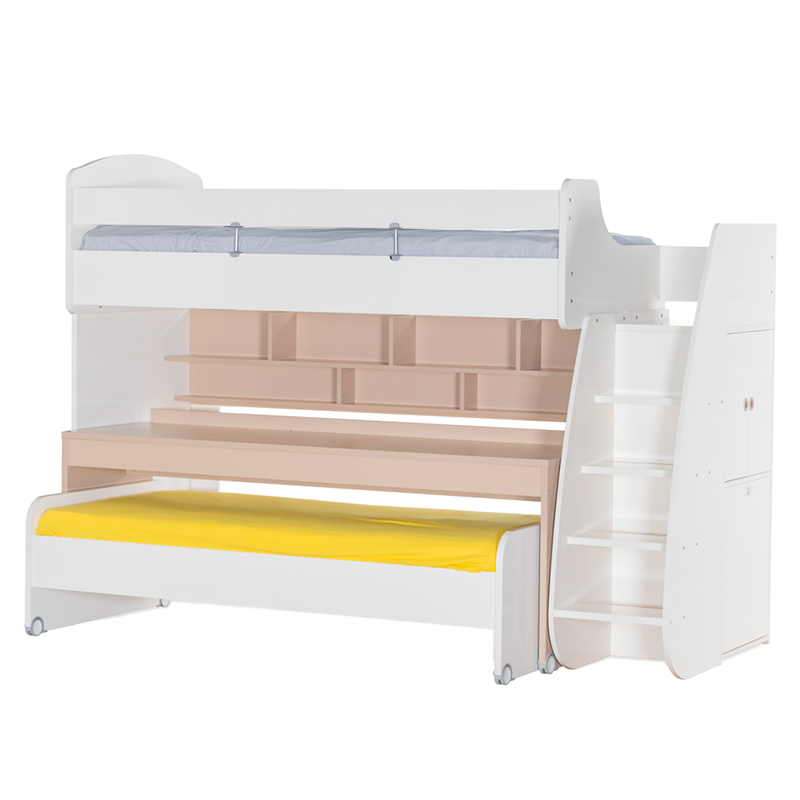 Съчетайте с бюрото и леглото с колелца, които могат да се поставят под основното легло. Те могат да се използват заедно или самостоятелно, а когато не са необходими, лесно да се приберат, освобождавайки място в стаята .Мебелите от серия JOYIN предлагат гъвкави възможности за обзавеждане на детската стая. Можете да създадете цялостен хармоничен интериор, комбинирайки всички елементи от серията – легло, гардероб, бюро, скрин и етажерка. Мебелите могат да се използват и самостоятелно или в частични комбинации, за да предложат идеалната персонализация спрямо вашите нужди и предпочитания.Вградените стълби от дясната страна на леглото крият тайна: два големи шкафа. Вратичките са с плавно затваряне за допълнителна безопасност, а отделенията стават идеално място за съхранение на играчки, книги, дрехи и други вещи, които често се разпръскват из стаята