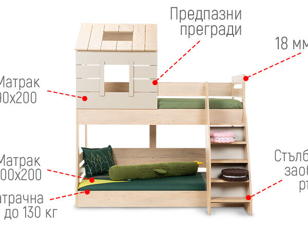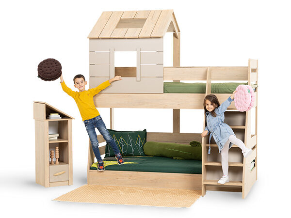 Двуетажното легло MY HOUSE превръща детската стая в магическо място, вдъхновено от природата. Конструкцията му, наподобяваща горска къщичка, съчетава естествени дървесни тонове и приказен стил, който пленява въображението на децата. Уникалният дизайн създава уютна и стимулираща среда за игра, учене и почивка.Основите на леглата са с товароносимост 130 кг и са достатъчно устойчиви за игривите скокове на малките палавници. Стълбичката, която може да бъде проектирана за лява или дясна страна, осигурява необходимата стабилност на децата при изкачване и слизане.Включените подматрачни рамки гарантират комфорт и функционалност.Мебелите от серията MY HOUSE предлагат гъвкави възможности за обзавеждане на детската стая. Можете да създадете цялостен хармоничен интериор, комбинирайки всички елементи от серията – легло, гардероб, бюро, скрин и етажерка.Могат да се използват и самостоятелно или в частични комбинации, за да предложат идеалната персонализация спрямо вашите нужди и предпочитания.
