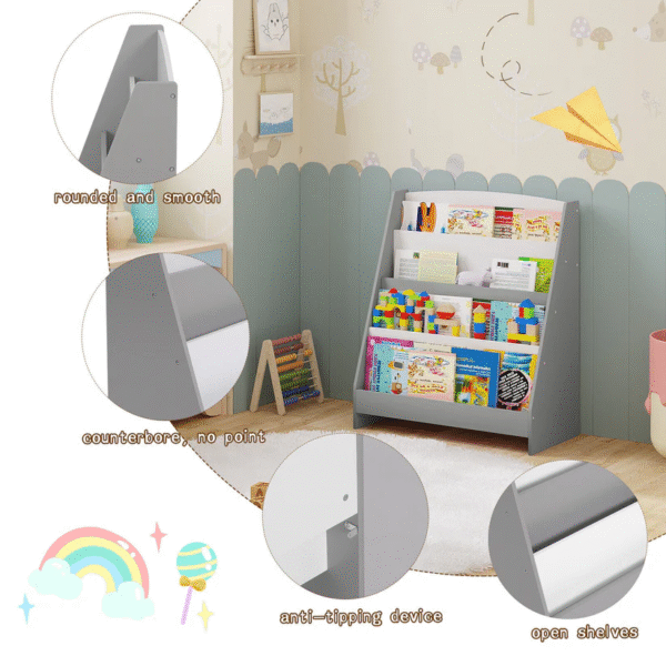 - Детската етажерка има четири рафта, които да съхранят книги за четене, картини за оцветяване, както и списания във всякакви форми и размери, удобни за децата.