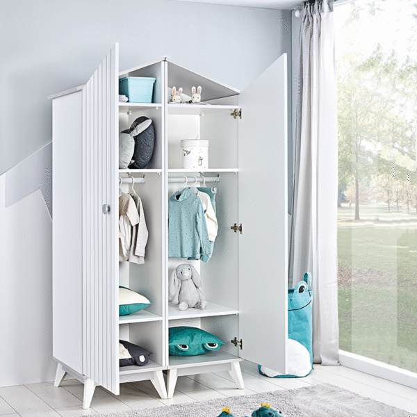 - Моделът разполага с вградено функционално LED осветление, което помага да се намери всичко необходимо. Изработеният от първокласен ПДЧ материал гардероб ще ви служи дълго време. За максимална безопасност за децата вратичката разполага с плавен механизъм за затваряне