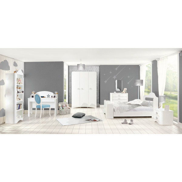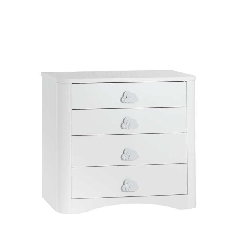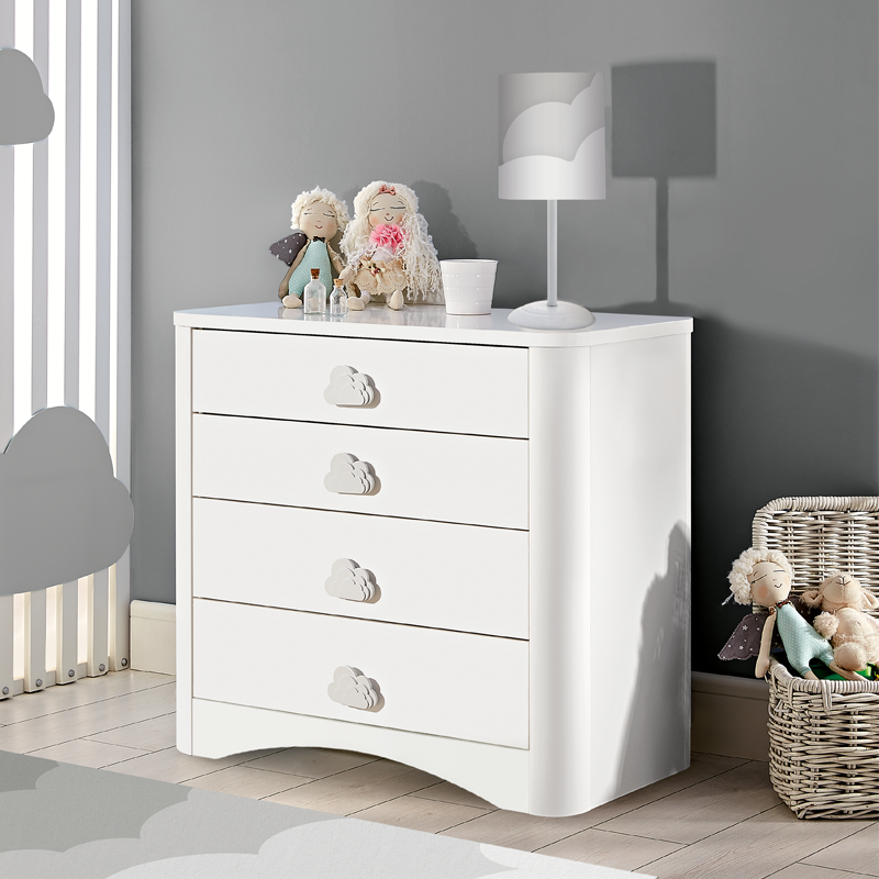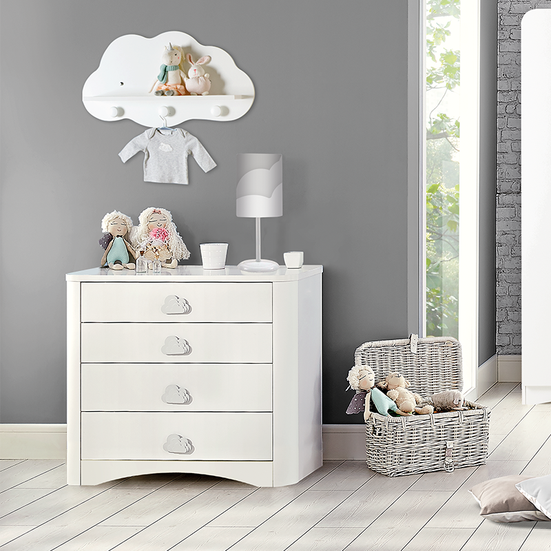 Изработен от първокачествено 18 мм и 8 мм ПДЧ, детският скрин Pori е здрав и надежден. Всяко чекмедже може да издържа до 25 кг, предлагайки достатъчно място за съхранение на всякакви предмети. Дръжките във формата на облаци са не само декоративни, но и изработени от здрав ABS материал, осигурявайки дълготрайност и устойчивост на ежедневна употреба. Със своя дизайн с меки ръбове и елегантна визия, този скрин добавя нотка щастие и уют към стаята на всяко дете. Неговите заоблени форми и нежен бял цвят го правят подходящ за всякакъв интериор и стил на обзавеждане. Мебелите от серията PORI предлагат гъвкави възможности за обзавеждане на детската стая. Можете да създадете цялостен хармоничен интериор, комбинирайки всички елементи от серията – легло, гардероб, бюро, скрин и етажерка. Могат да се използват и самостоятелно или в частични комбинации, за да предложат идеалната персонализация спрямо вашите нужди и предпочитания.