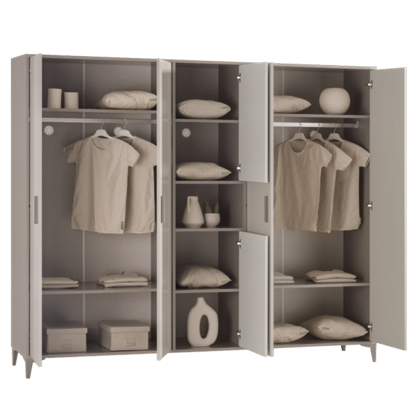 • Гардеробът RIGA с 5 крила впечатлява с изчистен дизайн и функционално вътрешно разпределение, подходящо за съхранение на дрехи, обувки и аксесоари.