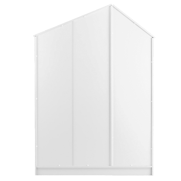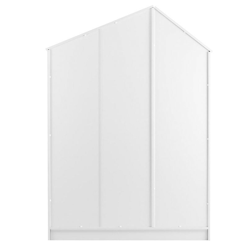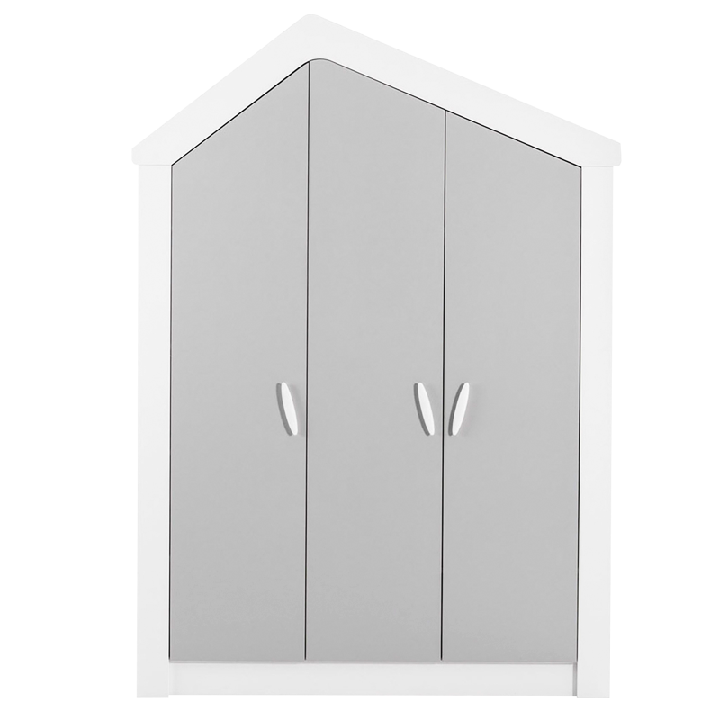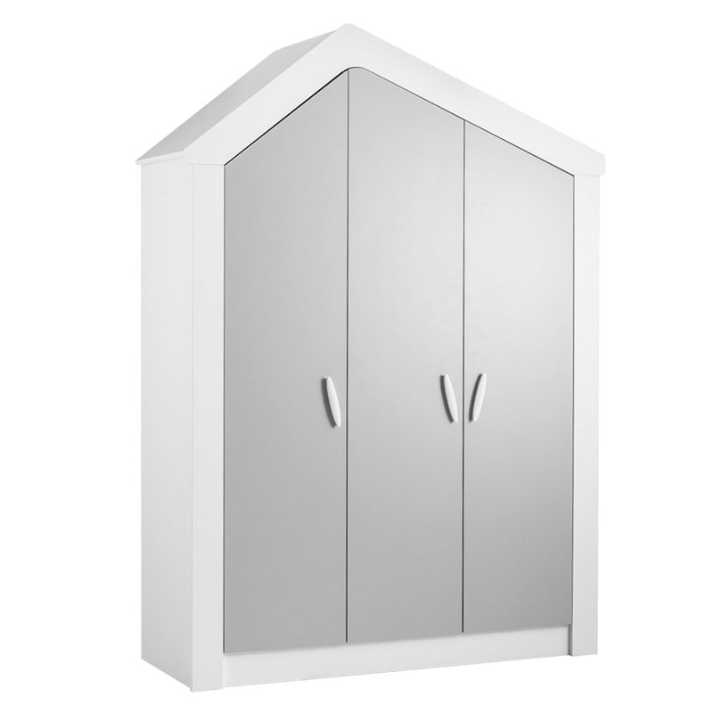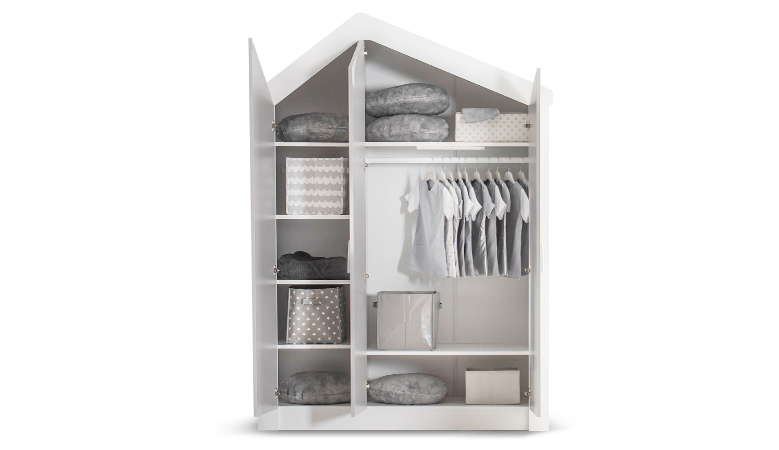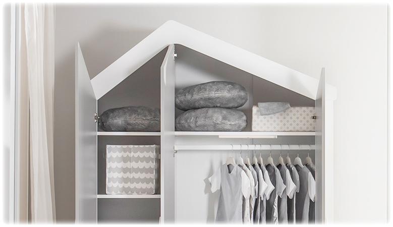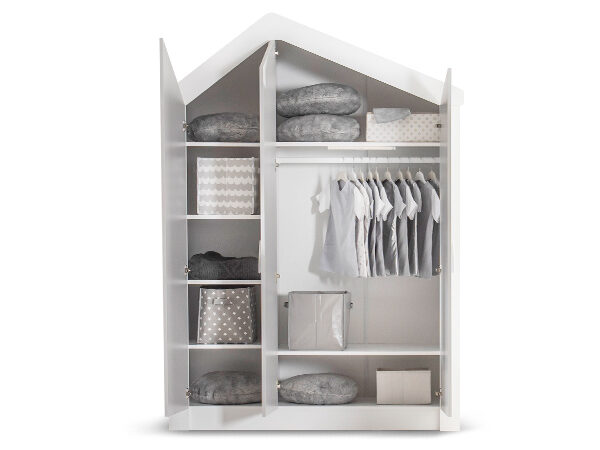 Моделът е изработен от ПДЧ с дебелина 18 мм. Всеки един от неговите рафтове издържа на натоварване до 25 кг. Вратите на трикрикрилния гардероб се прибират плавно и безопасно с помощта на механизъм за плавно затваряне.Гардеробът има три врати – единично и двойно крило. Разпределението на единичната част включва четири рафта, които обособяват в нея пет отделения. Двойната е организирана с един горен и един долен рафт, а помежду им е разположен лост за закачалки, като по този начин се оформят три просторни отделения. Рафтовете са свалящи се, с товароносимост 25 кг и позволяват съхранението на различни по обем и тежест дрехи.Гардероб WHITE HOUSE има врадено LED осветление в зоната за окачване, което осигурява добра видимост във вътрешното пространство. То се включва автоматично при отваряне и се изключва при затваряне на вратите, затова е удобно и лесно за използване. LED осветлението е енергийно ефективно и дълготрайно, което го прави практично допълнение към гардероба.