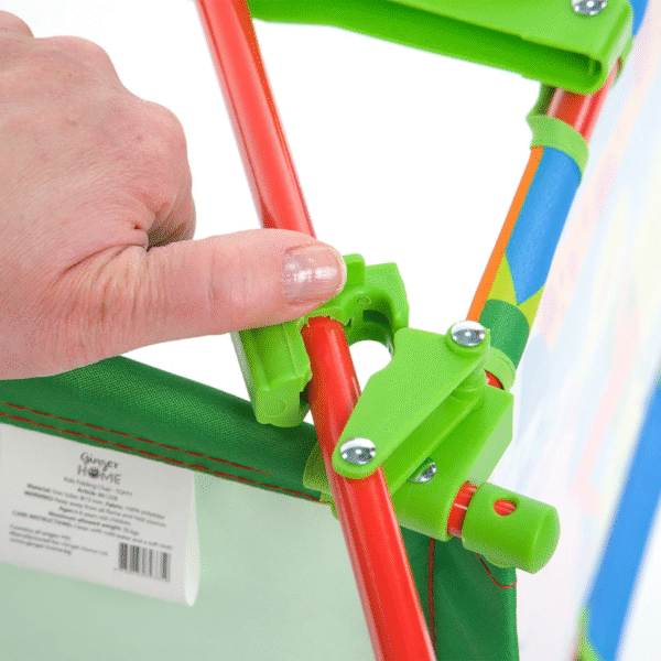 - Максимална безопасност: Здравата метална рамка, заоблените ъгли и подсилените пластмасови елементи на крачетата осигуряват стабилност и защита. Специалният механизъм предотвратява случайно сгъване, което прави това сгъваемо детско столче TOFFY сигурно за вашето дете.