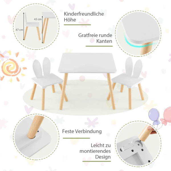 - Тестван за безопасност, здравина и стабилност комплектът детска дървена маса и 2 столчета отговаря на всички европейски стандарти.