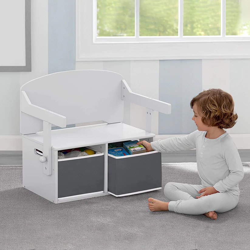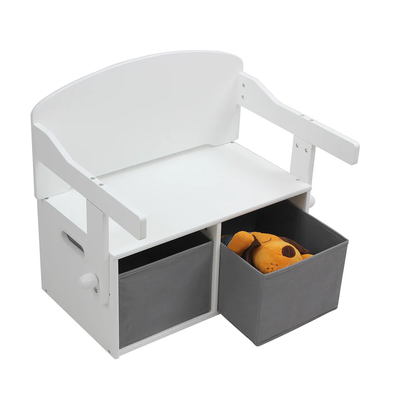 - Стабилна конструкция и място за съхранение: Два текстилни коша под седалката са идеални за организиране на книги, играчки или творчески материали.