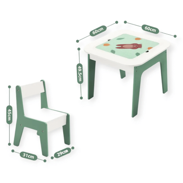 Комплект със столчета: Включва удобни и стабилни столчета, които съответстват на височината на масичката, осигурявайки комфорт по време на игра.