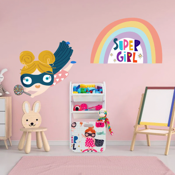 - Комплектът 2 броя стикери за стена с дъга SUPER GIRL са подходящи за детска стая, спалня за момичета, бебешка стая, хол, стая за игри, класна стая, всекидневна и др.
