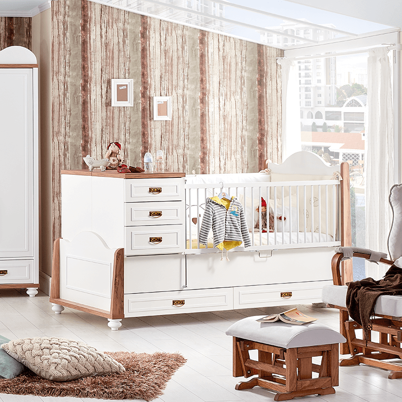 Системата за растящо легло позволява трансформация на основната конструкция във възрастово легло, ракла и нощно шкафче, които могат да се използват самостоятелно. Височината на предпазната преграда се регулира лесно чрез удобен механизъм с щракване. Леглото е изработено от висококачествени плоскости с дебелина 18–25 мм и издържа натоварване до 130 кг. Чекмеджетата са с плавно затваряне, изработени от 18 и 8 мм плоскости, с товароносимост до 25 кг. Чекмеджето на колелца се отваря в една посока и предлага просторно място за съхранение на спално бельо и принадлежности. Месинговите дръжки добавят ретро акцент и са едновременно стилни и издръжливи. Краката с височина 8 см от ABS материал позволяват лесно почистване с робот-прахосмукачка. Цената не включва матрак и аксесоари – те се предлагат отделно.