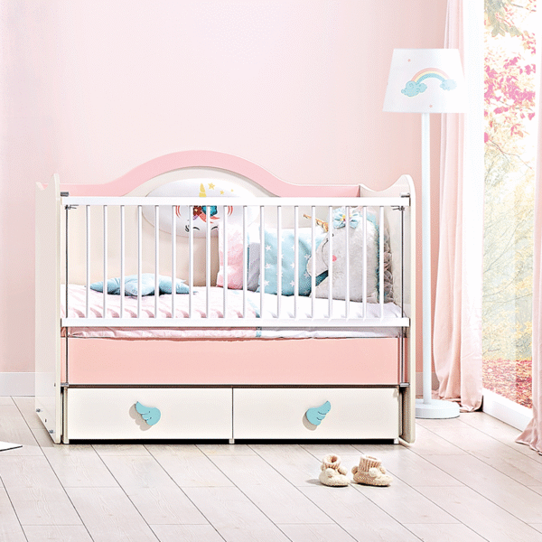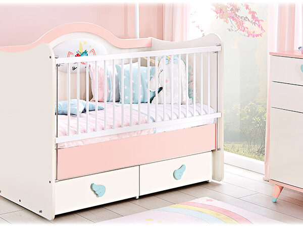 С елегантен дизайн, декорирано в пастелни цветове със сладки мотиви на еднорог, това креватче подобрява цялостната естетика на стаята. За практичност и удобство, кошарата разполага с 2 чекмеджета за съхранение и подвижна заключваща се преграда. Люлеещата функция нежно успокоява вашето бебе и му помага да заспи лесно, което е голямо облекчение за новите родители.Кошарата е част от колекция UNICORN, която включва скрин, гардероб, пейка, етажерка, килим, лампи и други аксесоари. Така лесно и бързо може да обзаведете детската стая без компромис за качеството или естетиката .