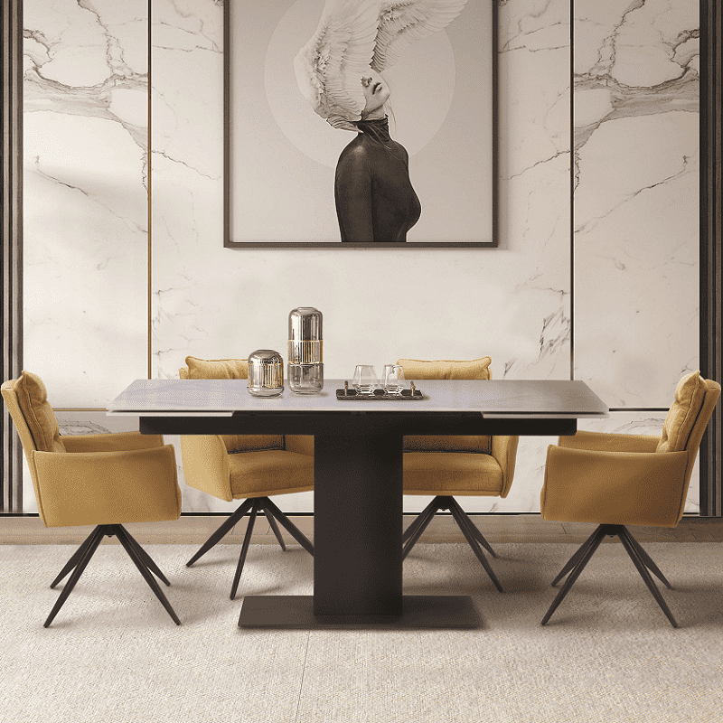 JURATA e масивна и луксозна трапезна маса, чиято основа е изработена от праховобоядисан метал, а плотът от керамика. Моделът притежава стабилна конструкция и функция за разтягане. Със своя семпъл и модерен дизайн, тя лесно ще се съчетае с всеки интериорен стил.